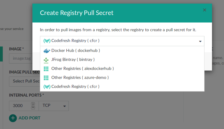 - From the list of all the connected Docker registries in Codefresh, select the registry you want. Codefresh automatically creates a secret for you.