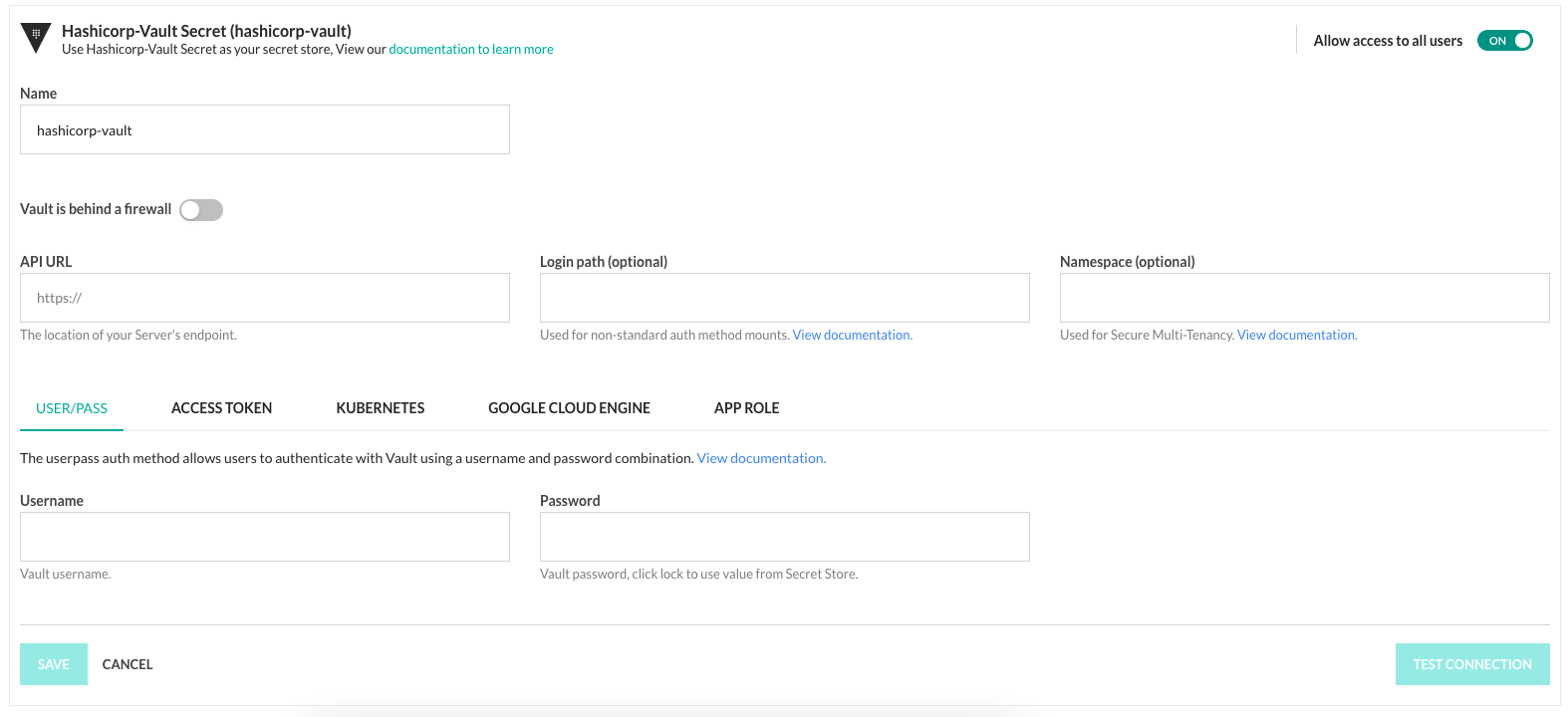 The other settings are specific to your Vault authentication method. Refer to the Vault documentation on how to get the required values.