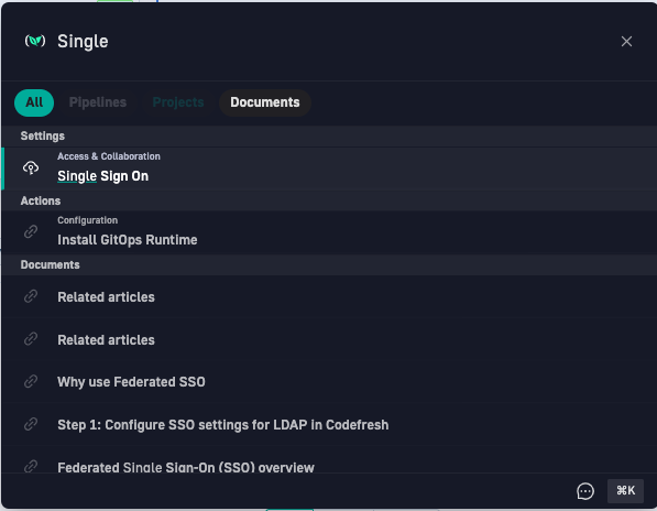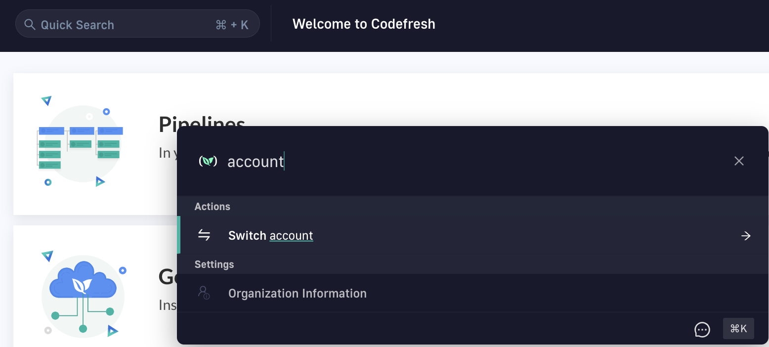 Use Global Search & Navigation to switch between Codefresh accounts. Instead of selecting the account to sign in to from your avatar, stay where you are, and use our built-in action to switch accounts.