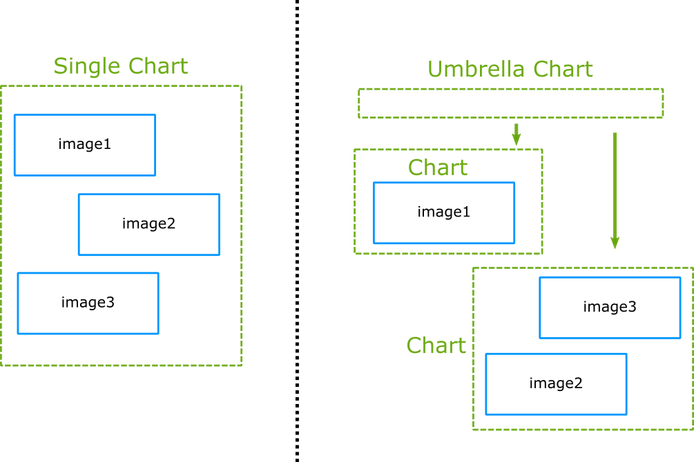 However, you can also create a chart with dependencies to other charts (a.k.a. umbrella chart), which are completely external using the requirements.yaml file. Using this strategy is optional and can work well in several organizations. Again, there is no definitive answer on right and wrong here, it depends on your team process.