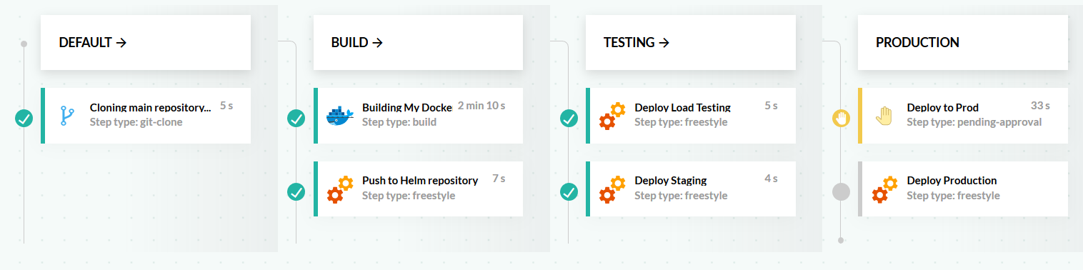 - Deployment of the promoted Helm chart happens to one of the production environments