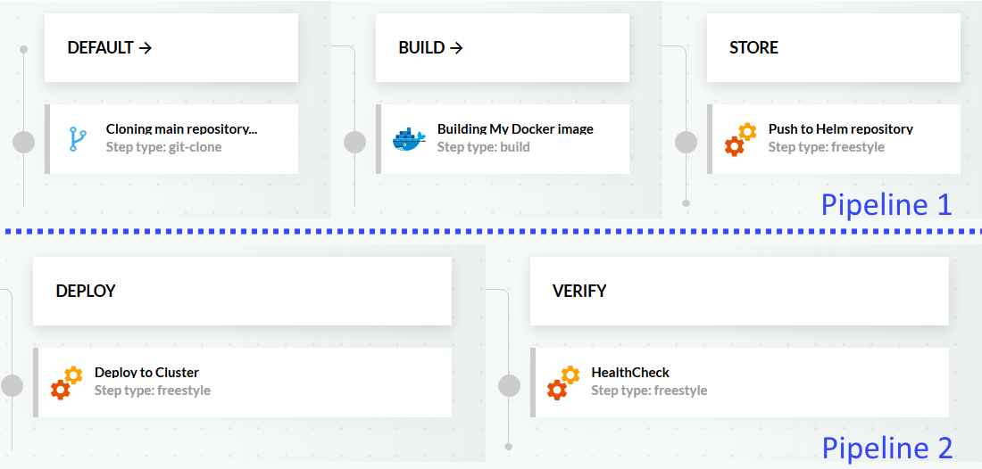 While this workflow is very flexible, it adds complexity on the number of Helm charts available (since they exist in multiple Helm repositories). You also need to set up the parameters between the different pipelines so that Helm charts to be deployed can be indeed found in the expected Helm repository.
