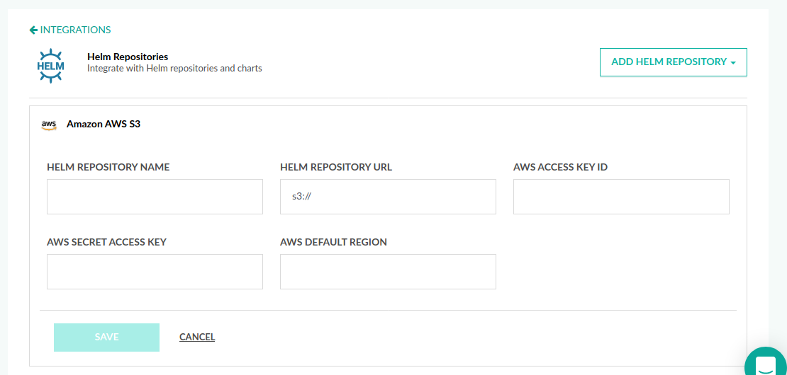 You can also connect an Amazon S3 bucket as a Helm repository through the Helm Repository integration options in Pipeline Integrations.
