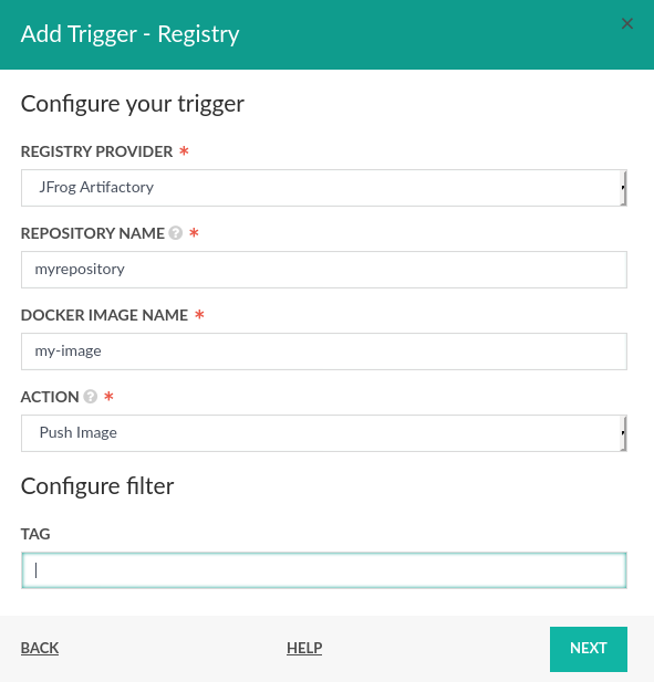 Push Imageaction. - Tag - optional filter to specify which image tags will trigger pipeline execution: Re2 regular expression.