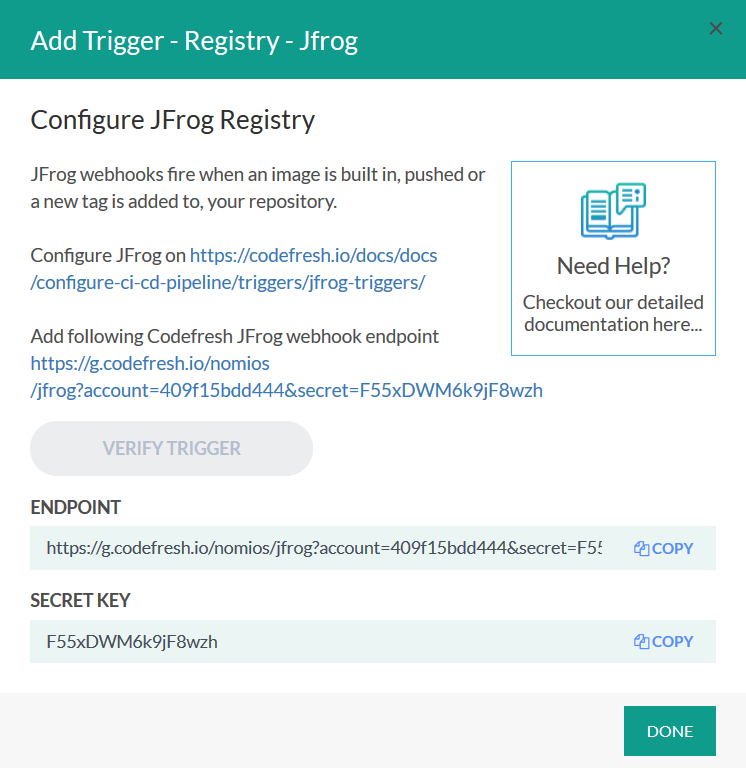 - Creating a trigger in Codefresh. This will result in a special Codefresh webhook URL