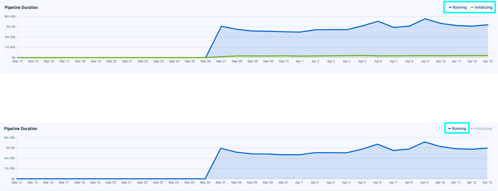 | Duration (Avg/P-50/P-90) | The length of time for the pipeline to complete execution according to the duration measure selected in the Duration chart. The comparison percentage is to the preceding (reference) date range. |