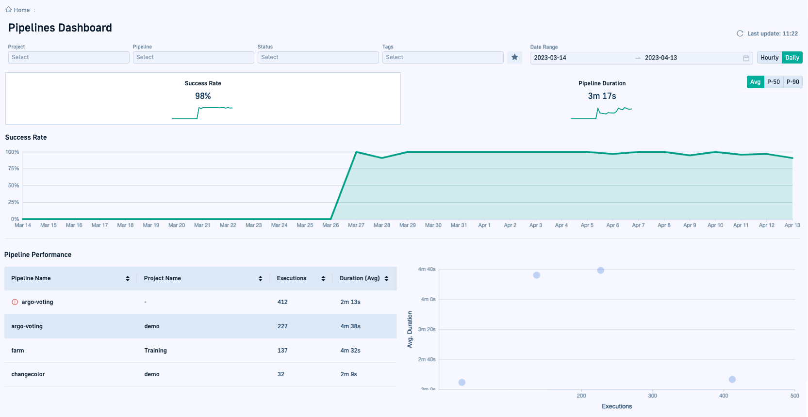 The time it takes for a pipeline workflow to complete the build, calculated from the total number of pipelines executed within the selected date range, unless you apply additional filters. You can switch between average (the default), and percentile views.