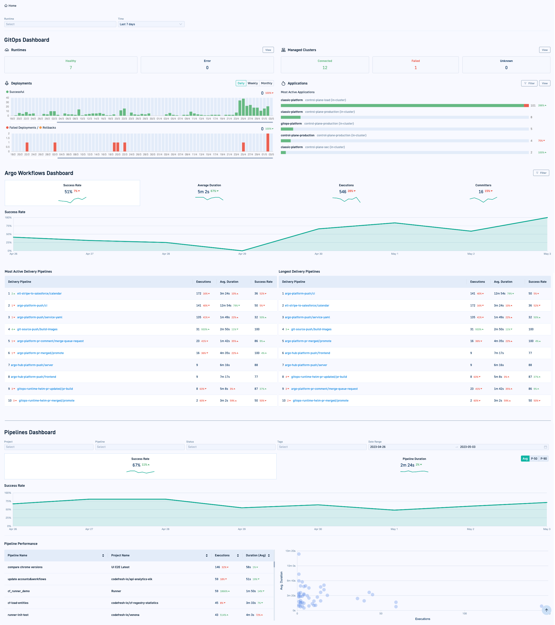 Get a global picture of performance for GitOps entities and pipelines in the Home dashboard with system-wide visualization for all stakeholders.