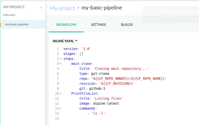 stages: []Save this spec into a file with an arbitrary name like my-pipeline-spec.yml. First create the new project (if it doesn’t exist already):