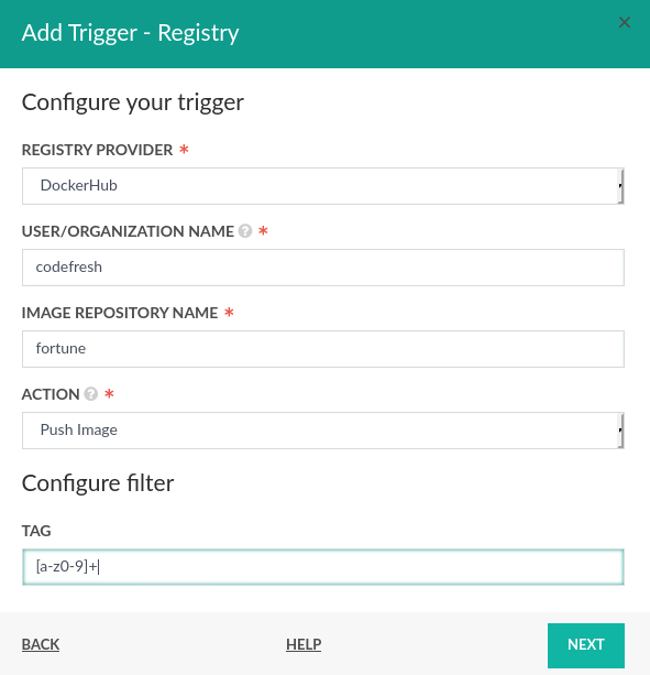 Push Imageaction. - Tag - optional filter to specify which image tags will trigger pipeline execution: Re2 regular expression.