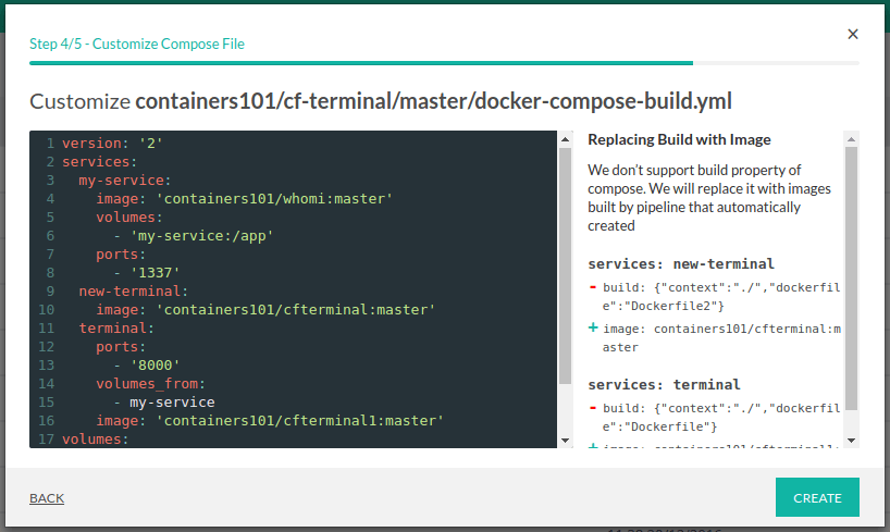 We don’t support thebuildproperty of Docker Compose. We will replace it with images automatically using a pipeline that is automatically created.