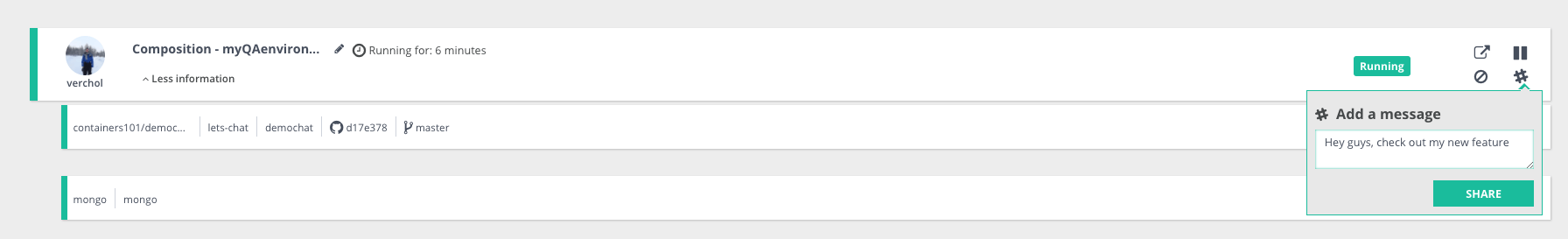 View a record for the running environment and all containers for the environment in the Running Compositions tab.