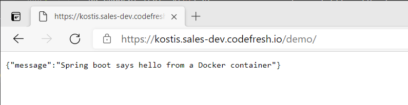 - mvn -Dmaven.repo.local=/codefresh/volume/m2_repository verify -Dserver.host=https://kostis.sales-dev.codefresh.io/${{CF_BRANCH_TAG_NORMALIZED}}/ -Dserver.port=443The end result of the pipeline is a deployment to the path that has the same name as the PR branch. For