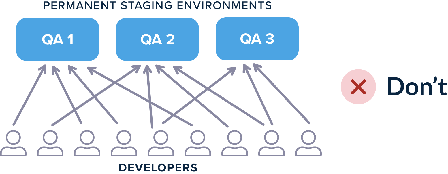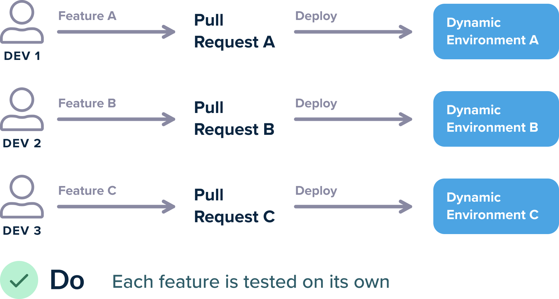 Each developer works in isolation to test their features. This pattern contrasts with the traditional way of reusing static preexisting environments.