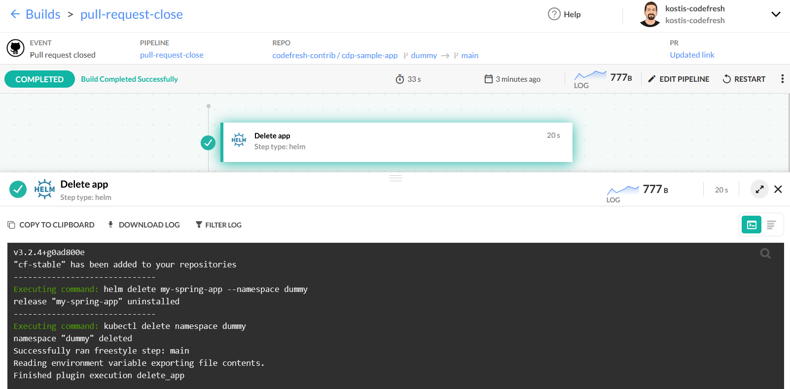 - kubectl delete namespace ${{CF_BRANCH_TAG_NORMALIZED}}The pipeline just uninstalls the Helm release for that namespace, and then deletes the namespace itself.