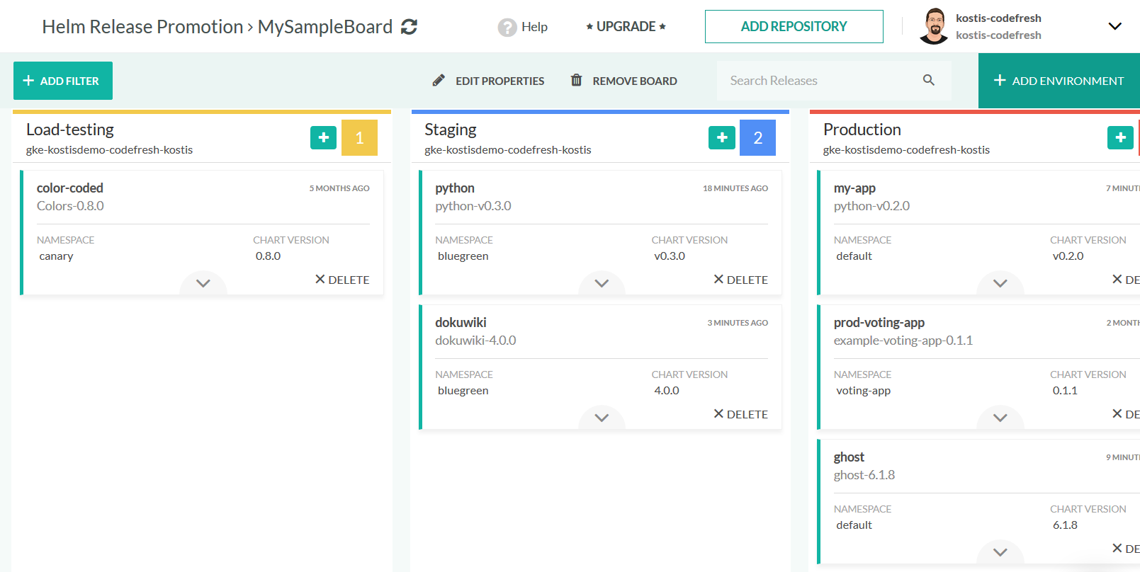Repeat the same process for additional environments. Remember that you can name your environment as you want and define any combination of cluster/namespace for any of the columns. This gives you a lot of power to define a Helm environment board that matches exactly your own process.