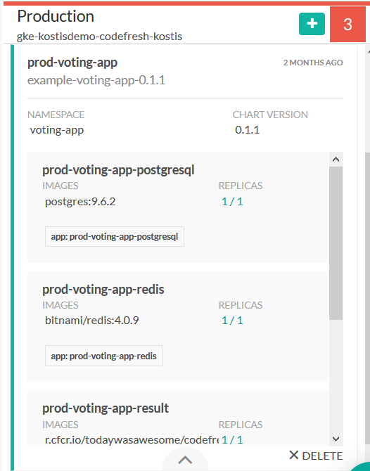 Apart from the Helm Releases dashboard that shows your Kubernetes clusters at the application level, Codefresh also comes with a special environment board that allows you to track one or more applications as they move within your infrastructure (example, Dev, QA, Prod).