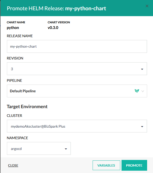 All fields here will be auto-filled according to the Helm release that you dragged. You can also choose a custom pipeline (see below) for the promotion if you don’t want to use the default one.