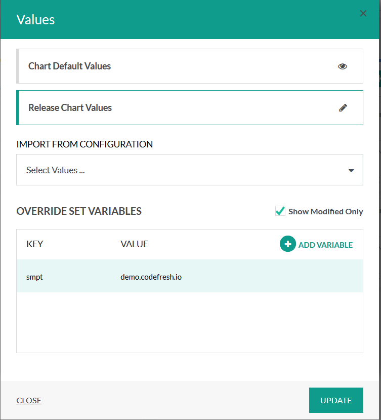 By clicking the Variables button you can override the chart values, import a specific shared configuration or add new values.