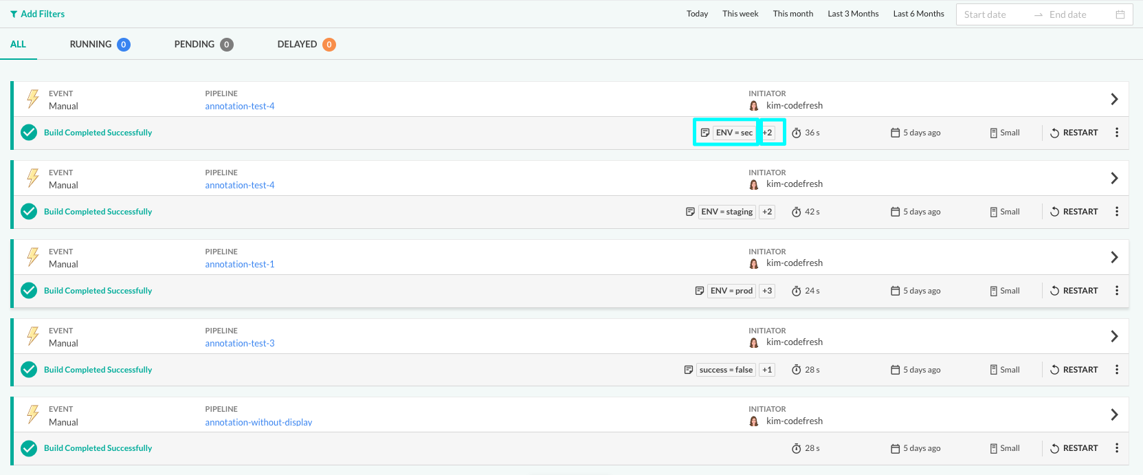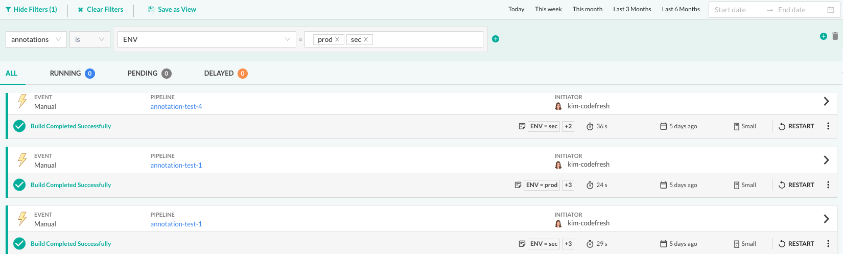 For example, annotate builds by environments by configuring the display attribute set to ENV. You can filter the Builds list by annotations and ENV values to view builds by their environments.