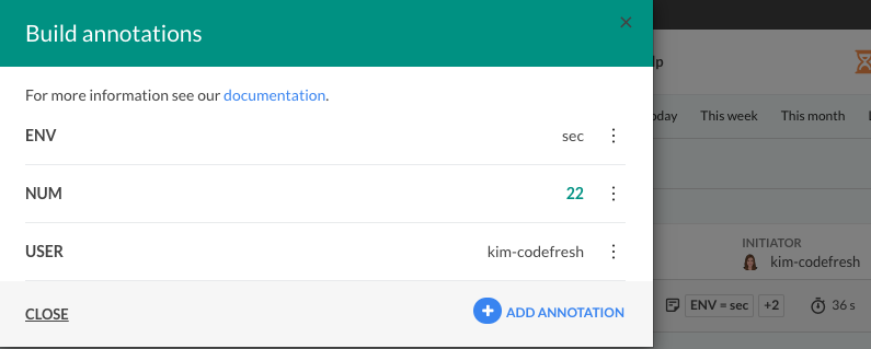 Codefresh supports adding custom annotations to several entities, such as projects, pipelines, builds, and Docker images. Custom annotations can store any optional information you wish to keep associated with an entity. Examples would be storing the test coverage for a particular build, a special settings file for a pipeline, identifying environments for builds.