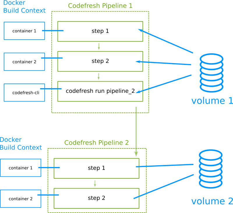 The common volume shared among build steps makes it very easy to create pipelines that work in a gradual manner where any step in the pipeline is using artifacts produced by a previous one.