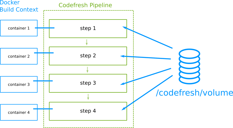 - All steps in Codefresh share the same “workspace” in the form of a shared Docker volume.