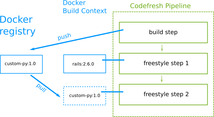 Now we reach one of the most powerful features of Codefresh pipelines. We have already seen that freestyle steps in pipelines are just a series of commands that run inside the context of a Docker container. In most cases the images used for the freestyle steps are known in advance and come from public (e.g. Dockerhub) or private Docker registries.