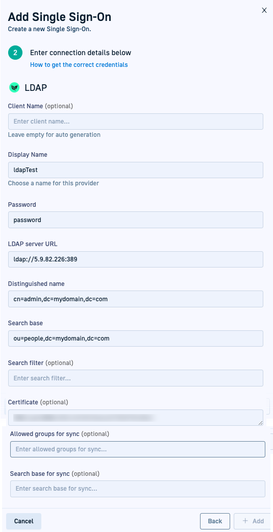 • For ldaps: The security certificate of the LDAP server. Paste the value directly on the field. Do not convert to base64 or any other encoding by hand.