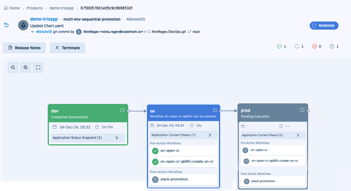Unlike the previous release (without workflows), this release for the same Promotion Flow (multi-env-sequential-promotion), only promotes changes to the next environment when all workflows associated with the current environment are complete.