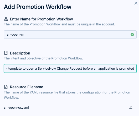 A template to open a ServiceNow Change Request before an application is promoted. - Resource Filename: The name of the manifest file that will be saved in