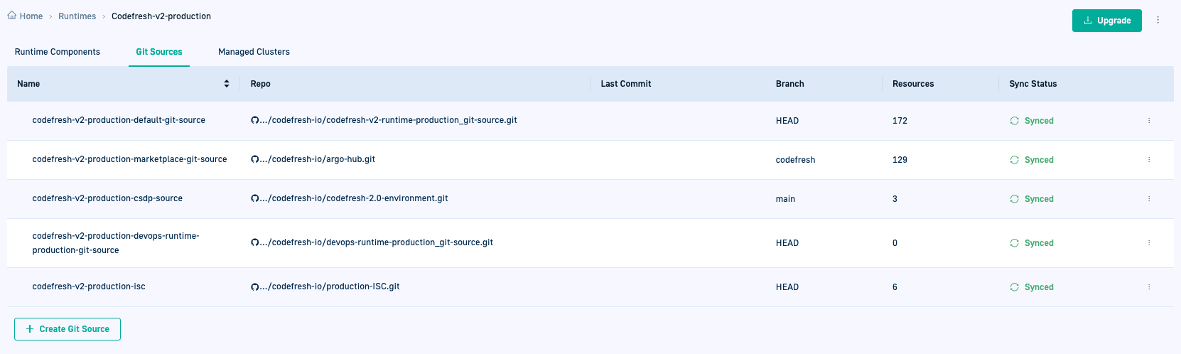 The Git Source connects to a Git repository within your organization, serving as an easy way to manage the deployment and configuration of Argo CD applications on clusters. The Git repository referenced by the Git Source stores application manifests and other resources which are always synced to the cluster. Codefresh manages the Git Source itself as an Argo CD application. To monitor sync status for all Git Sources across your runtime in one place, see Runtime Status Panel.