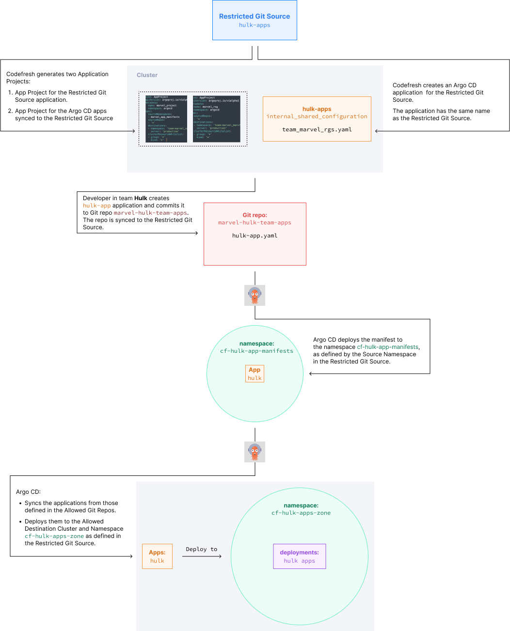 - Administrators set up Restricted Git Sources in Codefresh with the Git repo, cluster, and namespace definitions