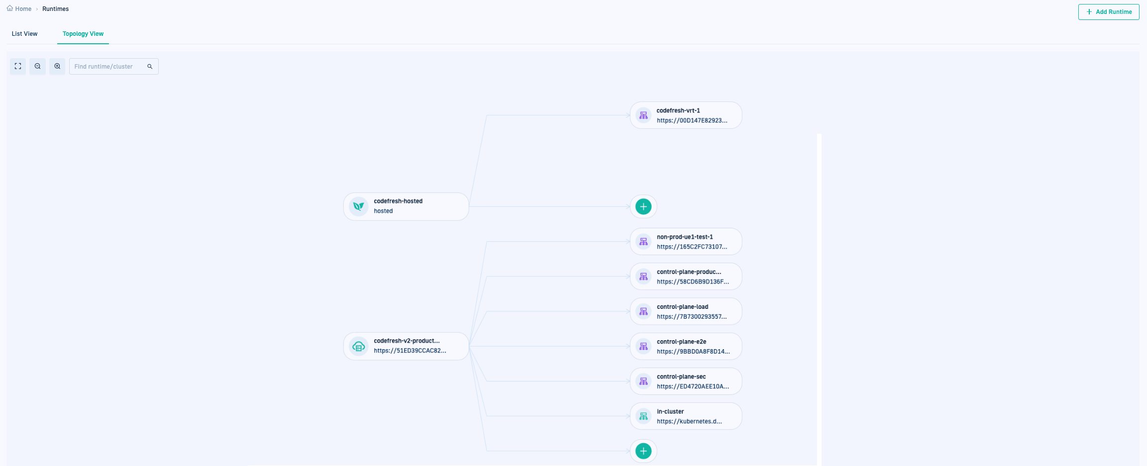 - Topology view: Displays a hierarchical view of Runtimes and the clusters managed by them, with health and sync status of each cluster.