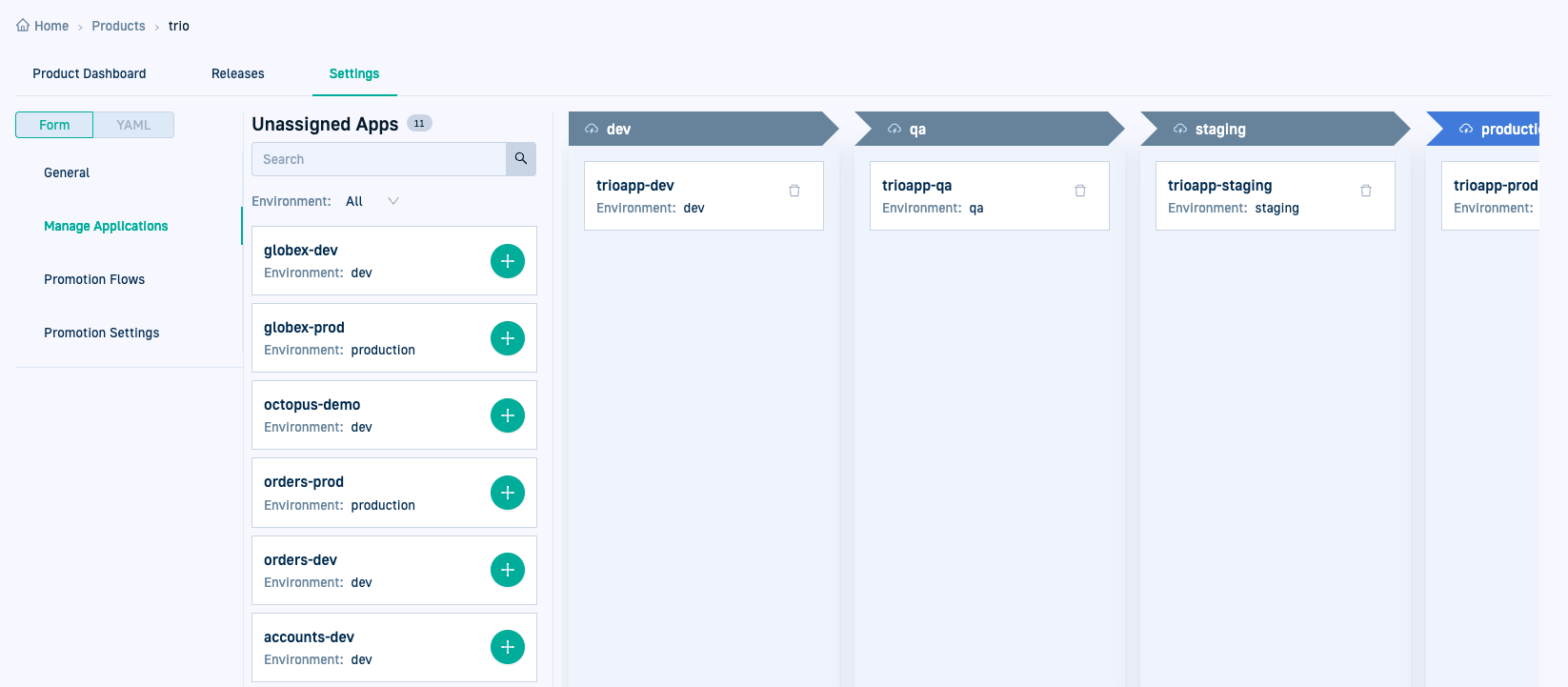 Select one or more predefined Promotion Flows valid for the product, and customize the trigger conditions for each flow for automated deployments. -