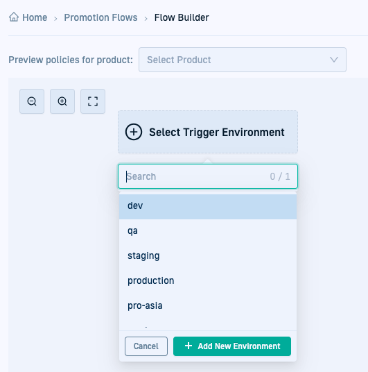 Visually design and create the flow by selecting environments, Promotion Actions, and Workflows, and defining dependencies through the Flow Builder. If needed, create new environments and promotion workflows on-the-fly when doing so.