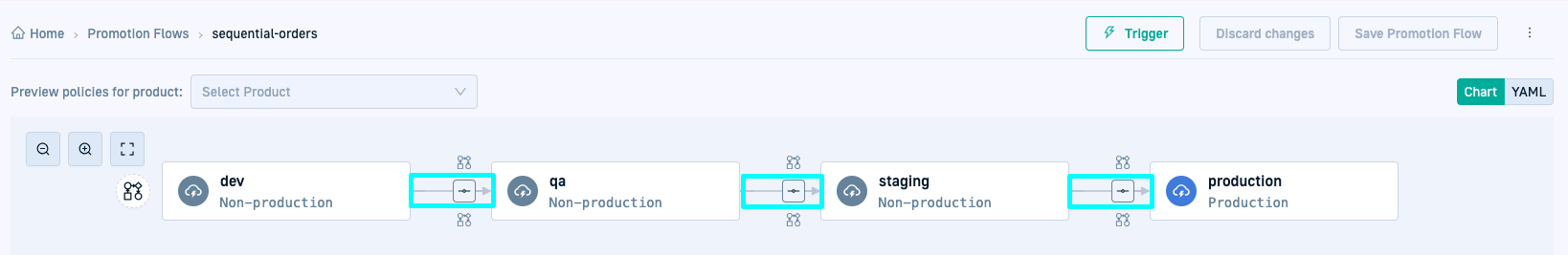 Promotion Flows start with a Trigger Environment, where the change to the application initiates the flow, and continue with one or more target environments where changes are promoted. You need at least one target environment in a Promotion Flow.