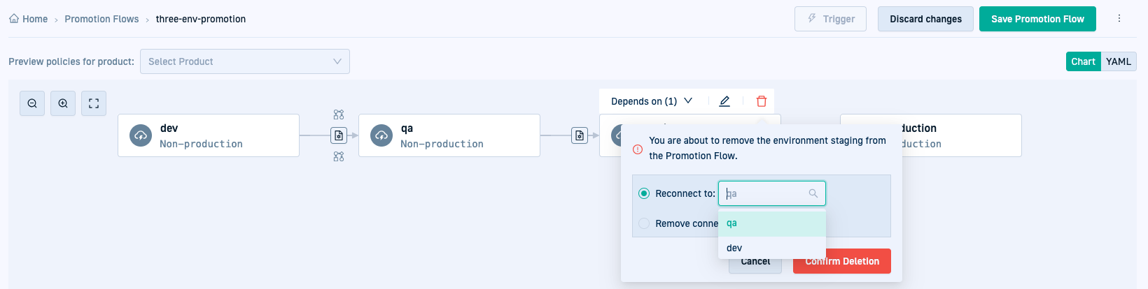 For example, consider a promotion flow with dev, qa, staging, and prod environments in that order. When removing the staging environment which is linked to production, you need to reconnect to one of the preceding environments, qa selected in the example above.