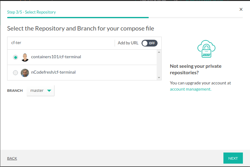 Click Add by URL, and then enter the URL of the repo. - From the Branch dropdown, select a branch for the first build.