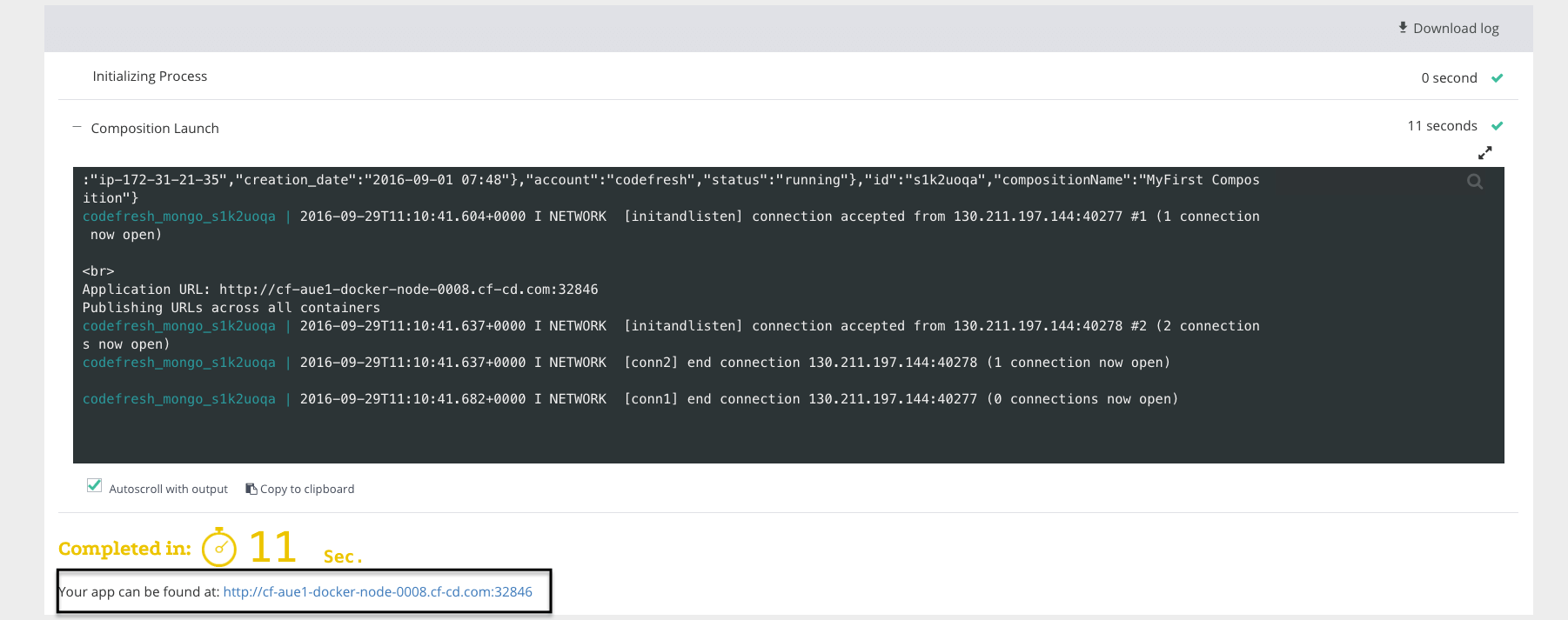 When you are ready with the composition, launch it to inspect your application. Launching a composition creates a temporary test environment in your Codefresh account that you can use to inspect your application.