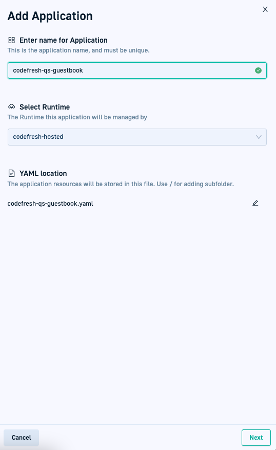 Application definitions include the application name, the GitOps Runtime, and the name of the YAML manifest. By default, the YAML manifest has the same name as that of the application.
