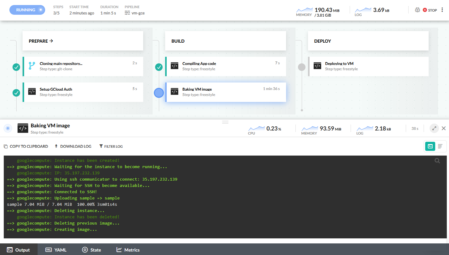 This Codefresh pipeline creates a VM image and then uses it to launch a Google Compute instance.