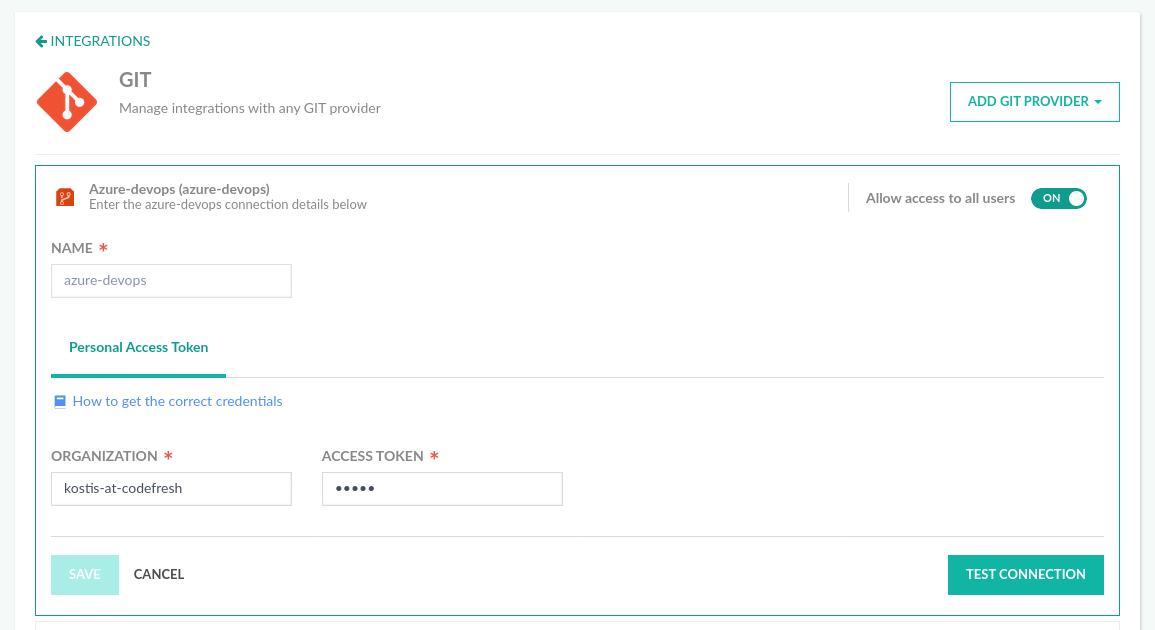 Once configuration is complete all Codefresh users can login using their Azure credentials instead of personal accounts.