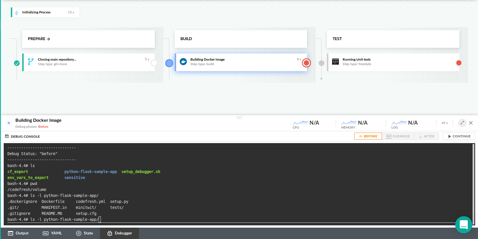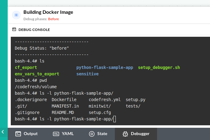 In all cases the shared Codefresh volume is automounted so you can examine your source code or any other intermediate artifacts placed in your project folder or the pipeline cache.