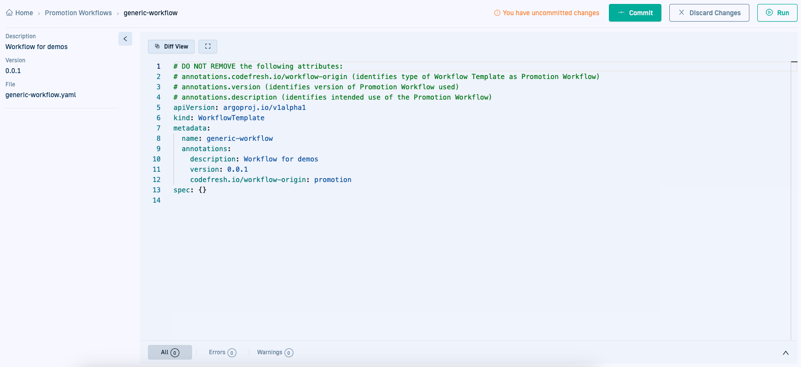 metadata.annotations.version. The version is displayed in the Promotion Workflows list in the UI. You should update it manually when there are changes. - To test the Promotion Workflow with the current settings before committing the changes, click Run.
