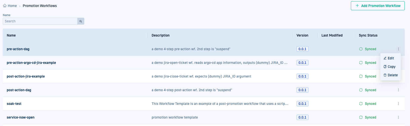 When the YAML file is synced to the cluster, it is displayed in the Promotion Workflows list.