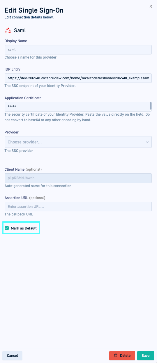 - Scroll down and select Set as default. The Single Sign-on page shows the SSO provider tagged as the default.