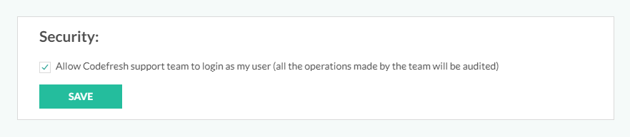 Enable Codefresh support personnel to access your user account. Access to your account is useful for visibility during troubleshooting. If you have an issue with the Codefresh platform, our support personnel can log into your account and look at running builds, inspect Docker images, run pipelines for you etc.