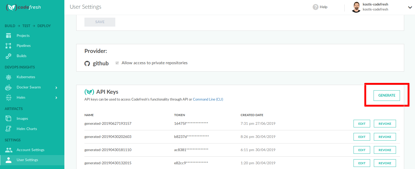 Generate new API keys to access Codefresh functionality from your scripts or applications, outside the Codefresh UI. Edit scopes for existing keys, or revoke them when needed.
