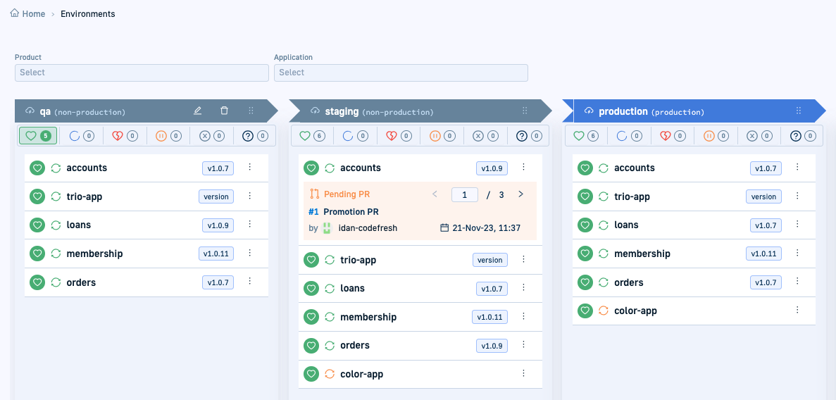 - In the Codfresh UI, from the sidebar, select Environments, and then select the environment with the product or application to promote.